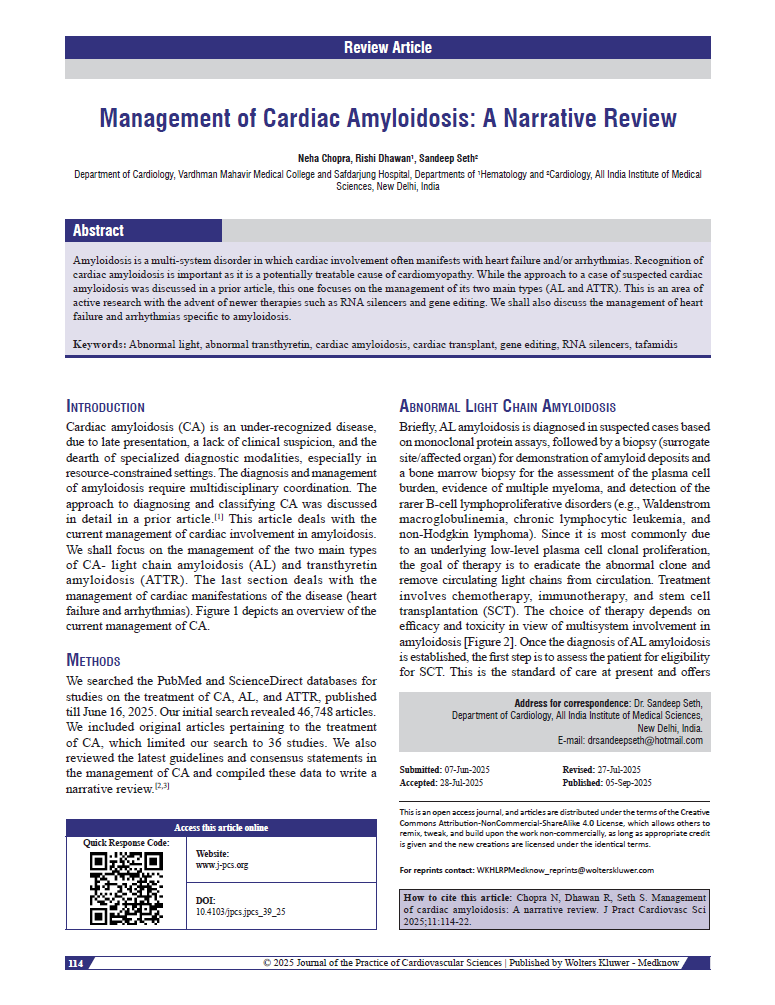 Abstract: Amyloidosis is a multi-system disorder in which cardiac involvement often manifests with heart failure and/or arrhythmias. Recognition of cardiac amyloidosis is important as it is a potentially treatable cause of cardiomyopathy. While the approach to a case of suspected cardiac amyloidosis was discussed in a prior article, this one focuses on the management of its two main types (AL and ATTR). This is an area of active research with the advent of newer therapies such as RNA silencers and gene editing. We shall also discuss the management of heart failure and arrhythmias specific to amyloidosis.
