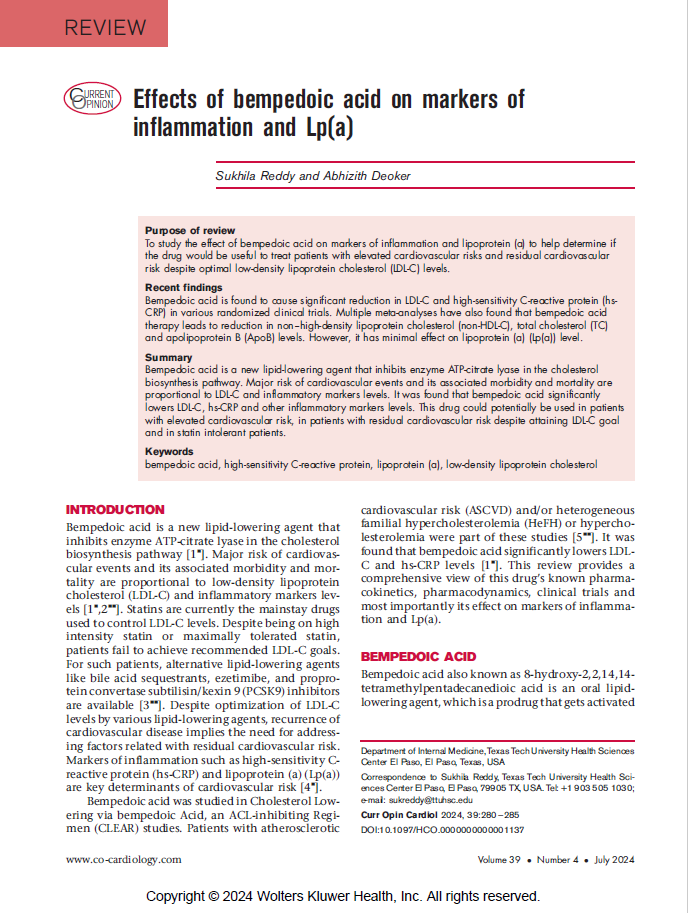 To study the effect of bempedoic acid on markers of inflammation and lipoprotein (a) to help determine if the drug would be useful to treat patients with elevated cardiovascular risks and residual cardiovascular risk despite optimal low-density lipoprotein cholesterol (LDL-C) levels.