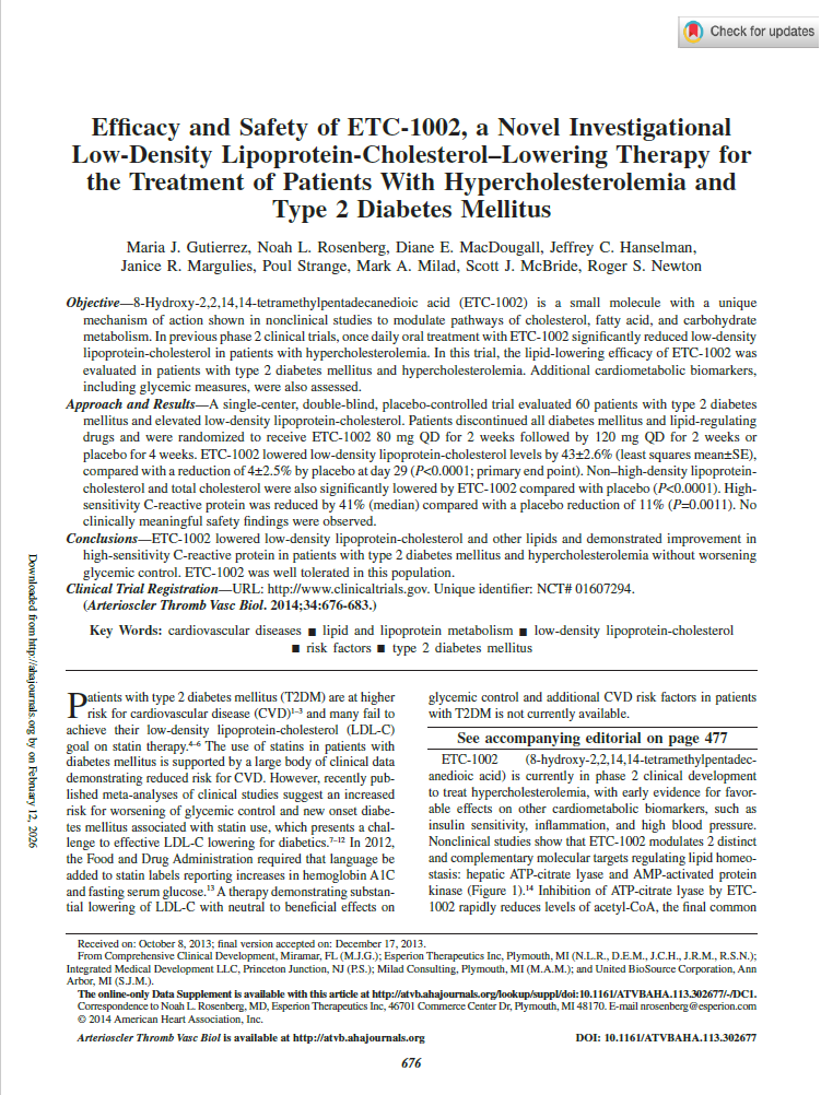 A single-center, double-blind, placebo-controlled trial evaluated 60 patients with type 2 diabetes mellitus and elevated low-density lipoprotein-cholesterol. Patients discontinued all diabetes mellitus and lipid-regulating drugs and were randomized to receive ETC-1002 80 mg QD for 2 weeks followed by 120 mg QD for 2 weeks or placebo for 4 weeks. ETC-1002 lowered low-density lipoprotein-cholesterol levels by 43±2.6% (least squares mean±SE), compared with a reduction of 4±2.5% by placebo at day 29 (P<0.0001; primary end point). Non–high-density lipoprotein-cholesterol and total cholesterol were also significantly lowered by ETC-1002 compared with placebo (P<0.0001). High-sensitivity C-reactive protein was reduced by 41% (median) compared with a placebo reduction of 11% (P=0.0011). No clinically meaningful safety findings were observed.