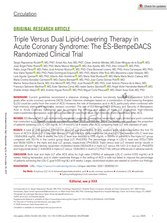 ES-BempeDACS is a multicenter, independent, pragmatic, prospective, randomized, open, blinded end point controlled trial conducted in 12 Spanish hospitals between November 2023 and October 2024. The primary end point was the proportion of patients achieving LDL-C <55 mg/dL (<1.4 mmol/L) at 8 weeks after ACS, comparing triple LLT with standard of care.