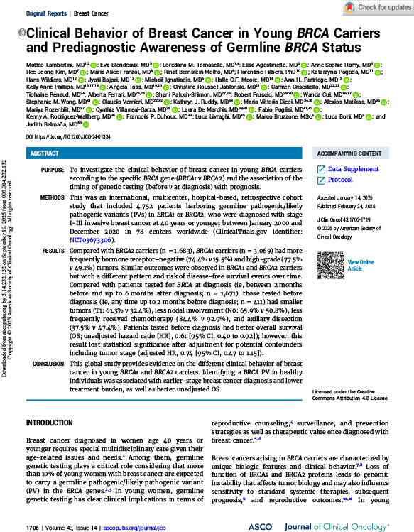 This was an international, multicenter, hospital-based, retrospective cohort study that included 4,752 patients harboring germline pathogenic/likely pathogenic variants (PVs) in BRCA1 or BRCA2, who were diagnosed with stage I-III invasive breast cancer at 40 years or younger between January 2000 and December 2020 in 78 centers worldwide (ClinicalTrials.gov identifier: NCT03673306).