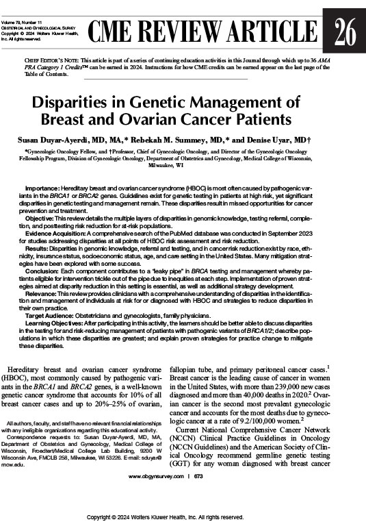 Learning Objectives: After participating in this activity, the learners should be better able to discuss disparities in the testing for and risk-reducing management of patients with pathogenic variants of BRCA1/2; describe populations in which these disparities are greatest; and explain proven strategies for practice change to mitigatethese disparities.