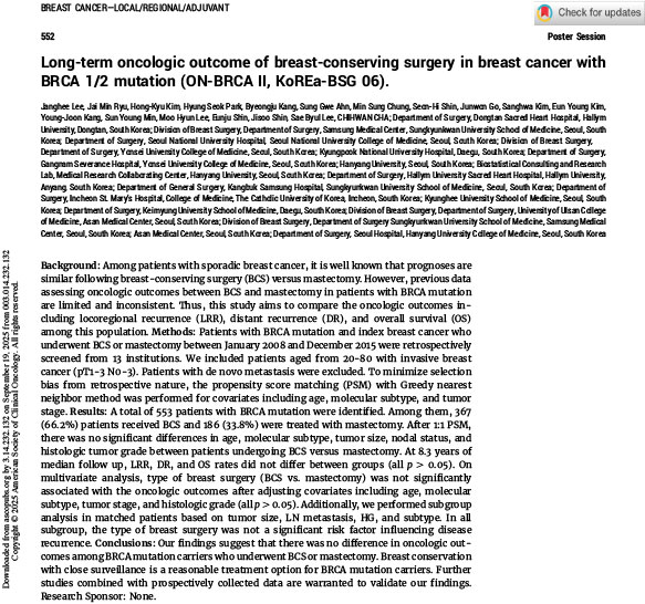 Background: Among patients with sporadic breast cancer, it is well known that prognoses are similar following breast-conserving surgery (BCS) versus mastectomy. However, previous data assessing oncologic outcomes between BCS and mastectomy in patients with BRCA mutation are limited and inconsistent. Thus, this study aims to compare the oncologic outcomes including locoregional recurrence (LRR), distant recurrence (DR), and overall survival (OS)among this population.