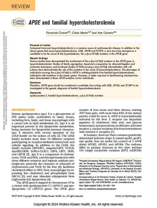 Various studies have demonstrated the involvement of the p.(Leu167del) mutation in the APOE gene in hypercholesterolemia: Studies of family segregation, lipoprotein composition by ultracentrifugation and proteomic techniques, and functional studies of VLDL-carrying p.(Leu167del) internalization with cell cultures have demonstrated the role of this mutation in the cause of hypercholesterolemia. The phenotype of individuals carrying the p.(Leu167del) in APOE is indistinguishable from familial hypercholesterolemia individuals with mutations in the classic genes. However, a better response to lipid-lowering treatment has been demonstrated in these APOE mutation carrier individuals.