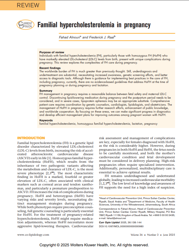 FH management in pregnancy requires a reasonable balance between fetal safety and maternal LDL-C control. Discontinuing lipid-lowering medication during pregnancy and the postpartum period needs to be considered, and in severe cases, lipoprotein apheresis may be an appropriate substitute. Comprehensive patient care requires coordination by genetic counselors, cardiologists, lipidologists, and obstetricians. The management of HoFH in pregnancy requires further research efforts, enhancement of public knowledge, and worldwide cooperation. By focusing on these areas, we can make significant progress in diagnostics and develop efficient management plans for improving outcomes among pregnant women with HoFH.