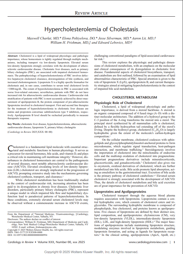 Cholesterol is a lipid of widespread physiologic and pathologic importance, whose homeostasis is tightly regulated through multiple mechanisms, including transport via low-density lipoprotein. Elevated serum low-density lipoprotein strongly correlates with the development of atherosclerotic cardiovascular disease. Cholestatic liver diseases, such as primary biliary cholangitis (PBC), are associated with impaired cholesterol homeostasis. The pathophysiology of hypercholesterolemia of PBC involves defective hepatocyte cholesterol clearance, downregulation of bile synthesis, and increased cholesterogenesis. Lipoprotein X is a highly specific biomarker for cholestasis and, in rare cases, contributes to serum total cholesterol levels >1000 mg/dL. The extent of hypercholesterolemia in PBC is associated with worse liver-related outcomes; nevertheless, patients with PBC do not have increased risk for atherosclerotic cardiovascular disease. Cardiovascular risk stratification of patients with PBC is most accurately achieved by direct measurement of apolipoprotein B, the protein component of pro-atherosclerotic lipoproteins involved in cholesterol transport. First and second line therapies for the treatment of hypercholesterolemia in cholestatic liver disease are statins and proprotein convertase subtilisin/kexin type 9 inhibitors, respectively. Apolipoprotein B level should be rechecked periodically to measure therapeutic response.