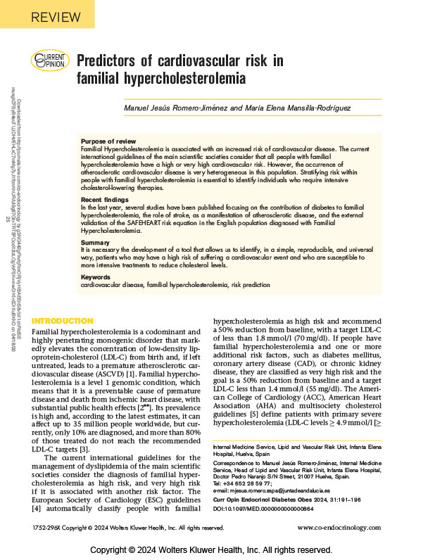In the last year, several studies have been published focusing on the contribution of diabetes to familial hypercholesterolemia, the role of stroke, as a manifestation of atherosclerotic disease, and the external validation of the SAFEHEART risk equation in the English population diagnosed with Familial Hypercholesterolemia.