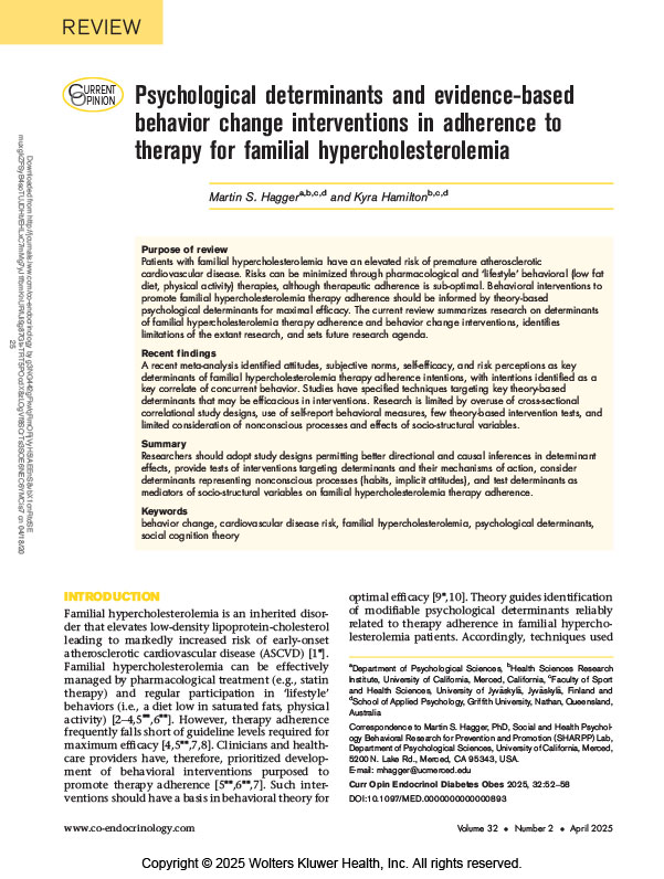 Researchers should adopt study designs permitting better directional and causal inferences in determinant effects, provide tests of interventions targeting determinants and their mechanisms of action, consider determinants representing nonconscious processes (habits, implicit attitudes), and test determinants as mediators of socio-structural variables on familial hypercholesterolemia therapy adherence.