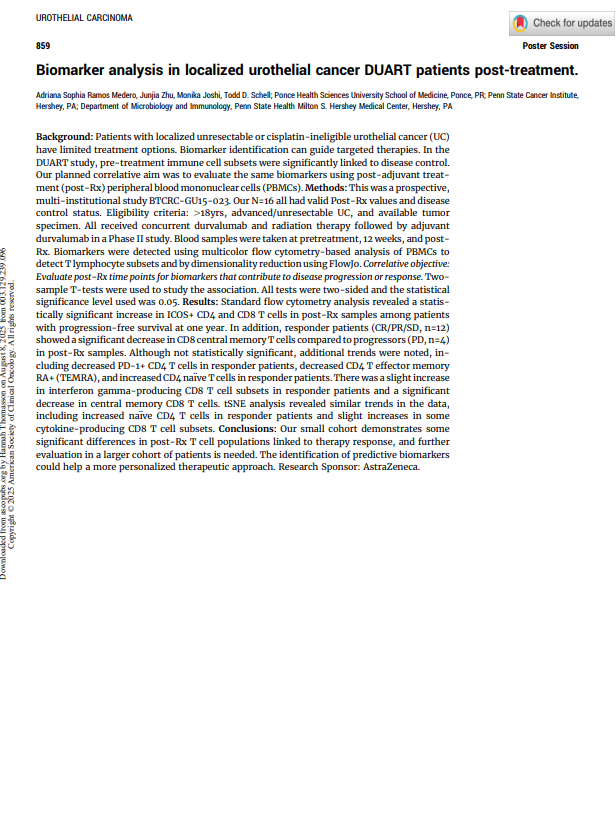 Background: Patients with localized unresectable or cisplatin-ineligible urothelial cancer (UC) have limited treatment options. Biomarker identification can guide targeted therapies. In the DUART study, pre-treatment immune cell subsets were significantly linked to disease control. Our planned correlative aim was to evaluate the same biomarkers using post-adjuvant treatment (post-Rx) peripheral blood mononuclear cells (PBMCs).