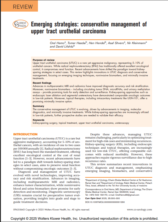 Upper tract urothelial carcinoma (UTUC) is a rare yet aggressive malignancy, representing 5–10% of urothelial cancers. While radical nephroureterectomy (RNU) has traditionally offered excellent oncological control, it compromises renal function. Recent advancements have shifted the paradigm toward kidney-sparing strategies in select cases. This review highlights innovations in UTUC diagnosis and conservative management, focusing on emerging imaging techniques, noninvasive biomarkers, and minimally invasive treatments.