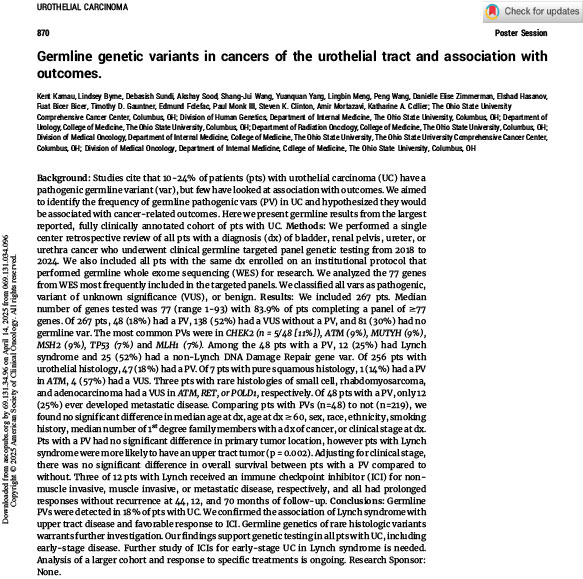 Background: Studies cite that 10-24% of patients (pts) with urothelial carcinoma (UC) have a pathogenic germline variant (var), but few have looked at association with outcomes. We aimed to identify the frequency of germline pathogenic vars (PV) in UC and hypothesized they would be associated with cancer-related outcomes. Here we present germline results from the largest reported, fully clinically annotated cohort of pts with UC. Methods: We performed a single center retrospective review of all pts with a diagnosis (dx) of bladder, renal pelvis, ureter, or urethra cancer who underwent clinical germline targeted panel genetic testing from 2018 to 2024. We also included all pts with the same dx enrolled on an institutional protocol that performed germline whole exome sequencing (WES) for research. We analyzed the 77 genes from WES most frequently included in the targeted panels. We classified all vars as pathogenic, variant of unknown significance (VUS), or benign. Results: We included 267 pts. Median number of genes tested was 77 (range 1-93) with 83.9% of pts completing a panel of ≥77 genes. Of 267 pts, 48 (18%) had a PV, 138 (52%) had a VUS without a PV, and 81 (30%) had no germline var. The most common PVs were in CHEK2 (n = 5/48 [11%]), ATM (9%), MUTYH (9%), MSH2 (9%), TP53 (7%) and MLH1 (7%). Among the 48 pts with a PV, 12 (25%) had Lynch syndrome and 25 (52%) had a non-Lynch DNA Damage Repair gene var. Of 256 pts with urothelial histology, 47 (18%) had a PV. Of 7 pts with pure squamous histology, 1 (14%) had a PV in ATM, 4 (57%) had a VUS. Three pts with rare histologies of small cell, rhabdomyosarcoma, and adenocarcinoma had a VUS in ATM, RET, or POLD1, respectively. Of 48 pts with a PV, only 12 (25%) ever developed metastatic disease. Comparing pts with PVs (n=48) to not (n=219), we found no significant difference in median age at dx, age at dx ≥ 60, sex, race, ethnicity, smoking history, median number of 1st degree family members with a dx of cancer, or clinical stage at dx. Pts with a PV had no significant difference in primary tumor location, however pts with Lynch syndrome were more likely to have an upper tract tumor (p = 0.002). Adjusting for clinical stage, there was no significant difference in overall survival between pts with a PV compared to without. Three of 12 pts with Lynch received an immune checkpoint inhibitor (ICI) for non-muscle invasive, muscle invasive, or metastatic disease, respectively, and all had prolonged responses without recurrence at 44, 12, and 70 months of follow-up. Conclusions: Germline PVs were detected in 18% of pts with UC. We confirmed the association of Lynch syndrome with upper tract disease and favorable response to ICI. Germline genetics of rare histologic variants warrants further investigation. Our findings support genetic testing in all pts with UC, including early-stage disease. Further study of ICIs for early-stage UC in Lynch syndrome is needed. Analysis of a larger cohort and response to specific treatments is ongoing.
