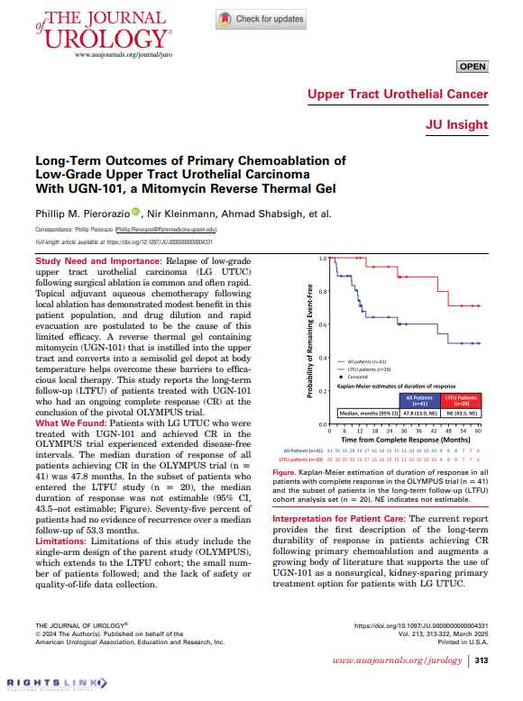 Patients who participated in the OLYMPUS trial (IRB No. TC-UT-03, NCT02793128) and achieved a complete response (CR) after 6 weekly doses of UGN-101 were followed up to 12 months after initial CR. Those with CR at study completion were eligible for long-term follow-up for up to 5 years or until disease recurrence, progression, or death.
