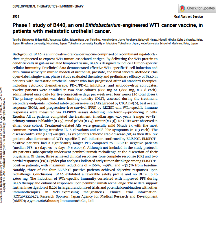 Background: B440 is an innovative oral cancer vaccine comprised of recombinant Bifidobacterium engineered to express WT1 tumor-associated antigen. By delivering the WT1 protein to dendritic cells in gut-associated lymphoid tissue, B440 is designed to induce a tumor-specific cellular immunity. Preclinical data demonstrated effective WT1-specific T-cell induction and anti-tumor activity in murine models of urothelial, prostate, and renal cancers.