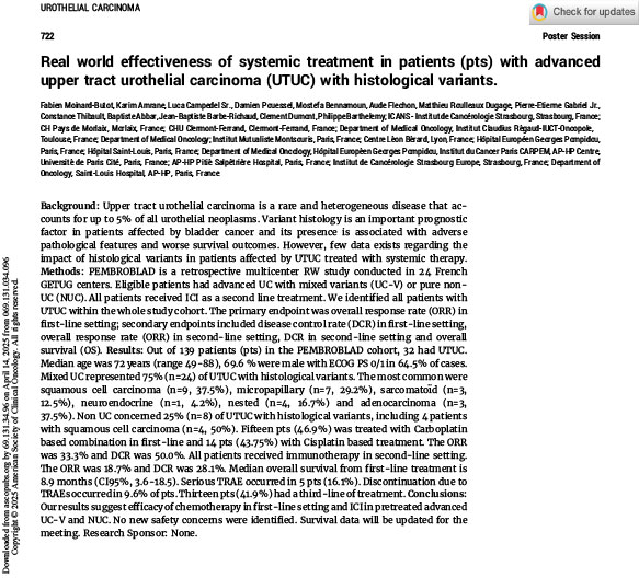 Background: Upper tract urothelial carcinoma is a rare and heterogeneous disease that accounts for up to 5% of all urothelial neoplasms. Variant histology is an important prognostic factor in patients affected by bladder cancer and its presence is associated with adverse pathological features and worse survival outcomes. However, few data exists regarding the impact of histological variants in patients affected by UTUC treated with systemic therapy. Methods: PEMBROBLAD is a retrospective multicenter RW study conducted in 24 French GETUG centers. Eligible patients had advanced UC with mixed variants (UC-V) or pure non-UC (NUC). All patients received ICI as a second line treatment. We identified all patients with UTUC within the whole study cohort. The primary endpoint was overall response rate (ORR) in first-line setting; secondary endpoints included disease control rate (DCR) in first-line setting, overall response rate (ORR) in second-line setting, DCR in second-line setting and overall survival (OS). Results: Out of 139 patients (pts) in the PEMBROBLAD cohort, 32 had UTUC. Median age was 72 years (range 49-88), 69.6 % were male with ECOG PS 0/1 in 64.5% of cases. Mixed UC represented 75% (n=24) of UTUC with histological variants. The most common were squamous cell carcinoma (n=9, 37.5%), micropapillary (n=7, 29.2%), sarcomatoïd (n=3, 12.5%), neuroendocrine (n=1, 4.2%), nested (n=4, 16.7%) and adenocarcinoma (n=3, 37.5%). Non UC concerned 25% (n=8) of UTUC with histological variants, including 4 patients with squamous cell carcinoma (n=4, 50%). Fifteen pts (46.9%) was treated with Carboplatin based combination in first-line and 14 pts (43.75%) with Cisplatin based treatment. The ORR was 33.3% and DCR was 50.0%. All patients received immunotherapy in second-line setting. The ORR was 18.7% and DCR was 28.1%. Median overall survival from first-line treatment is 8.9 months (CI95%, 3.6-18.5). Serious TRAE occurred in 5 pts (16.1%). Discontinuation due to TRAEs occurred in 9.6% of pts. Thirteen pts (41.9%) had a third-line of treatment. Conclusions: Our results suggest efficacy of chemotherapy in first-line setting and ICI in pretreated advanced UC-V and NUC. No new safety concerns were identified. Survival data will be updated for the meeting.